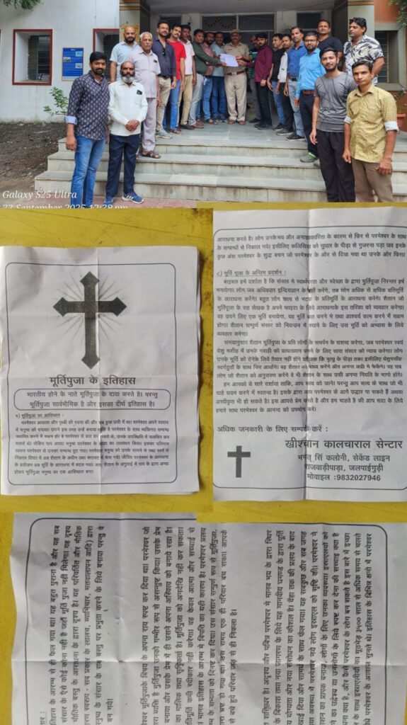 उदयपुर। उदयपुर जिले के धार्मिक भावनाओं को भड़काने का मामला सामने आया है जहां कुछ अज्ञात लोगों द्वारा रात्रि के समय दुकानों और घरों के बाहर मूर्ति पूजा के विरोध के पर्चे डाले गए उसके बाद दुकानदारों के साथ विभिन्न हिंदू संगठनों ने इसका विरोध जताया। नवरात्रि के बीच उदयपुर के डबोक थाना क्षेत्र में अज्ञात लोगों ने रात के अंधेरे में घरों और दुकानों के बाहर विवादित पर्चे डालकर धार्मिक माहौल बिगाड़ने की कोशिश की है। इन पर्चों में मूर्ति पूजा पर विवादित टिप्पणी की है। हिंदू देवी-देवताओं की आस्था पर सवाल उठाए गए हैं। पर्चे पर ख्रीश्चान कालचारल सेंटार जलपाईगुड़ी,” का नाम और क्रॉस का चिन्ह छपा हुआ मिला है। दुकानदारों और क्षेत्रवासियों ने जैसे ही इन पर्चों को देखा, इलाके में भारी आक्रोश फैल गया। देखते ही देखते हिंदू संगठन और सर्व समाज के प्रतिनिधि डबोक थाने पहुँच गए और थानाधिकारी को ज्ञापन सौंपकर दोषियों की तुरंत गिरफ्तारी की मांग की। कार्यकर्ताओं ने चेतावनी दी कि अगर ऐसी हरकत करने वालों पर सख्त कार्रवाई नहीं हुई तो उग्र आंदोलन किया जाएगा। इस दौरान RSS और विश्व हिंदू परिषद के पदाधिकारी भी बड़ी संख्या में मौजूद रहे। उन्होंने कहा कि करोड़ों हिंदुओं की आस्था पर चोट करने वाली यह हरकत किसी भी कीमत पर बर्दाश्त नहीं की जाएगी। पुलिस ने मामले को गंभीरता से लेते हुए पर्चों को जब्त किया है और आसपास लगे सीसीटीवी कैमरों की फुटेज खंगालना शुरू कर दिया है। थानाधिकारी हुकुम सिंह ने बताया कि आरोपियों की पहचान कर जल्द ही उन्हें गिरफ्तार किया जाएगा। एक तरफ धर्मांतरण विरोधी बिल राजस्थान की विधानसभा में पारित हुआ है उसके बाद यह मामला सामने आया है।ज्ञापन सौंपने पहुंचे कार्यकर्ताओं में राष्ट्रीय स्वयंसेवक संघ डबोक मंडल के डालचंद शर्मा, शांतिलाल सोनी, भरत सोनी, ललित पालीवाल, यशराज सिंह देवड़ा, नरेंद्र सिंह देवड़ा, मनोहर नंदवाना, विजेंद्र सिंह झाला, ललित प्रजापत, शेखर प्रजापत, सुरेश प्रजापत, महेंद्र खोखावत, किशन क्षोत्रिय, आयुष सोनी, मनीष कोठारी, चेतन माली, कनीराम बंजारा, जितेंद्र गर्ग, बंटी तेली और गोपाल प्रजापत सहित कई स्वयंसेवक मौजूद थे। सभी ने एक स्वर में कहा कि इस तरह की हरकतों से सामाजिक सदभावना बिगड़ता है और इसे किसी भी कीमत पर बर्दाश्त नहीं किया जाएगा।
