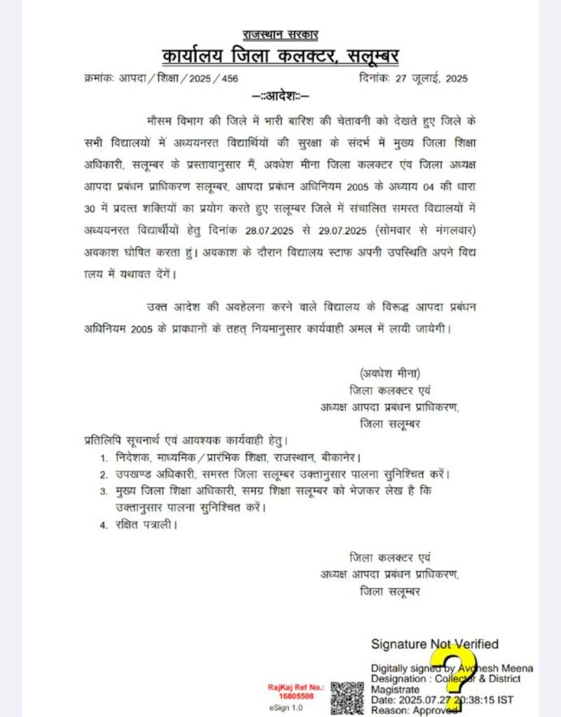 यह आदेश जिला कलेक्टर एवं अध्यक्ष आपदा प्रबंधन प्राधिकरण, सलूम्बर अवधेश मीणा ने आपदा प्रबंधन अधिनियम 2005 की धारा 30 के तहत जारी किया है। आदेश के अनुसार, विद्यार्थियों की सुरक्षा सर्वोपरि है, और बारिश के कारण जनजीवन प्रभावित हो सकता है। अतः सभी शिक्षण संस्थानों (सरकारी एवं निजी) में विद्यार्थियों के लिए दो दिन का अवकाश रहेगा।