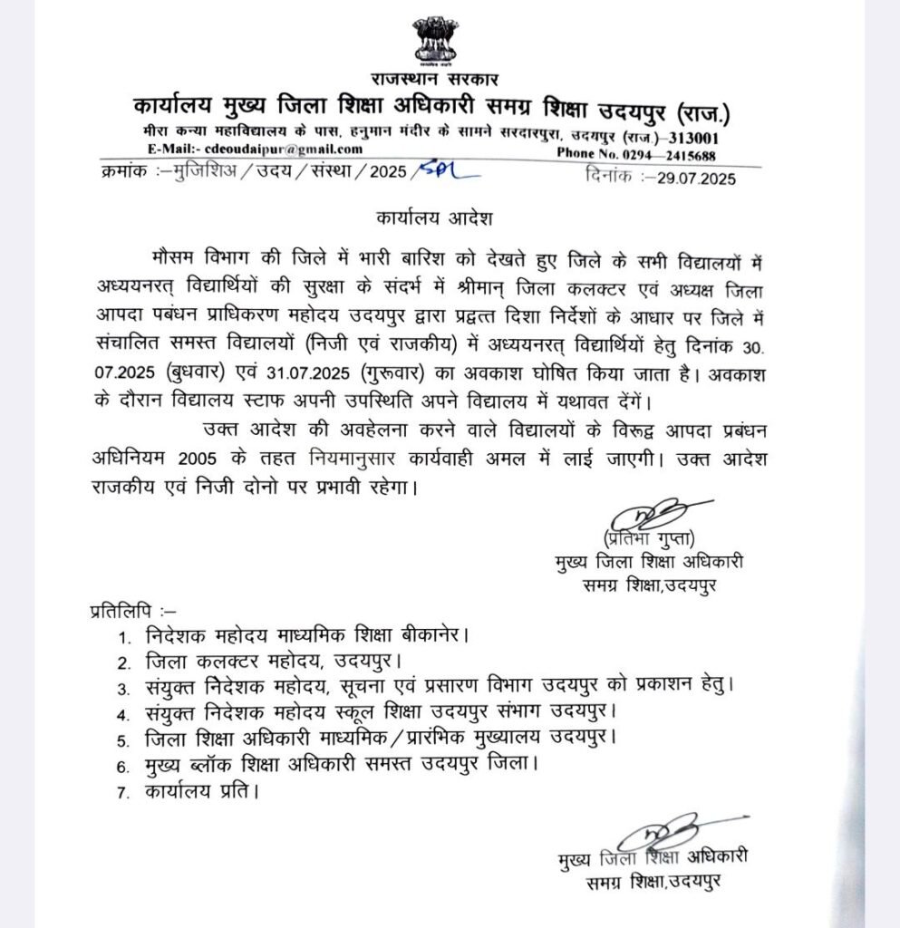 उदयपुर। उदयपुर जिले में भारी बारिश की संभावनाओं और मौसम विभाग द्वारा जारी अलर्ट को ध्यान में रखते हुए जिला कलेक्टर एवं जिला मजिस्ट्रेट श्री नमित मेहता ने बुधवार 30 जुलाई और गुरुवार 31 जुलाई को जिले के सभी राजकीय व निजी विद्यालयों में अवकाश घोषित कर दिया है।