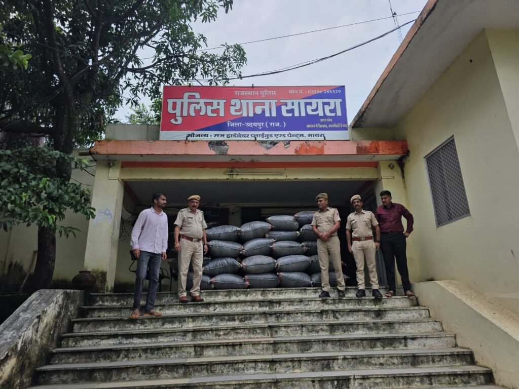 उदयपुर। उदयपुर जिले की सायरा थाना पुलिस ने बड़ी कार्यवाही करते हुए 70 लाख रुपए मूल्य का 458 किलो डोडा चूरा जप्त किया है। अवैध मादक पदार्थ से भरी कार पुलिस नाकाबंदी को तोड़कर भाग रही थी जिसे पुलिस ने पीछा कर पकड़ा। जिला पुलिस अधीक्षक योगेश गोयल ने अवैध मादक पदार्थों के खिलाफ एक विशेष अभियान चला रखा है इसी दौरान सायरा थाना अधिकारी किशोर सिंह शक्तावत को सूचना मिली कि एक स्कॉर्पियो में अवैध रूप से लाखों रुपए मूल्य का डोडा चूरा परिवहन कर ले जाया जा रहा है। इस सूचना पर थानाधिकारी के नेतृत्व में एएसआई बद्रीलाल, हेड कांस्टेबल नरेंद्र सिंह, कांस्टेबल लोकेंद्र सिंह, रुपाराम, धर्मेंद्र कुमार, भूपेंद्र सिंह, सत्यनारायण, प्रदीप और काना पुरी की टीम ने बरवाडा पहुंच बरवाडा पुलिया के पास नाकाबन्दी शुरू की। नाकाबन्दी के दौरान एक काले रंग की बिना नम्बरी स्कोर्पियो कार आती हुयी नजर आयी, जिसको रूकवाने का प्रयास किया गया तो नहीं रोक नाकाबन्दी को तोडकर भगाने लगा, जिसको टायर ब्रेकर स्टीक फेंक टायर ब्रस्ट किया गया। जो टायर ब्रस्ट होने पर भी कार चालक द्वारा कार को भगाकर ले जाने लगा, जिस पर पुलिस टीम ने कार का पिछा किया तो कार चालक कार को तेज गति से भगाकर ले जाते हुये हाईवे पर मोड पर कार को छोडकर कार चालक व उसके साथ एक व्यक्ति और उतरकर जंगल की तरफ भाग गए। पुलिस टीम ने कार से उतरकर भागे दोनो व्यक्तियों की तलाश शुरू की परन्तु जंगली ईलाका होने व रात होने से दोनो व्यक्ति भागने में कामयाब हो गये। बिना नम्बरी स्कोर्पियो की तलाशी ली तो उसके अंदर 23 प्लास्टिक के कटटो में 458.260 किलोग्राम डोडा चुरा भरा मिला। पुलिस के अनुसार स्कॉर्पियो में मिले डोडे चोरी की बाजार में कीमत 70 लाख रुपए है। पुलिस ने मुकदमा दर्ज कर आरोपियों की तलाश शुरू कर दी है।